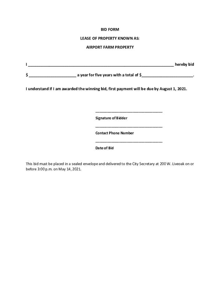 BID FORM LEASE OF PROPERTY KNOWN AS: AIRPORT FARM PROPERTY I hereby bid $ a year for five years with a total of $. I understand if I am awarded the winning bid, first payment will be due by August