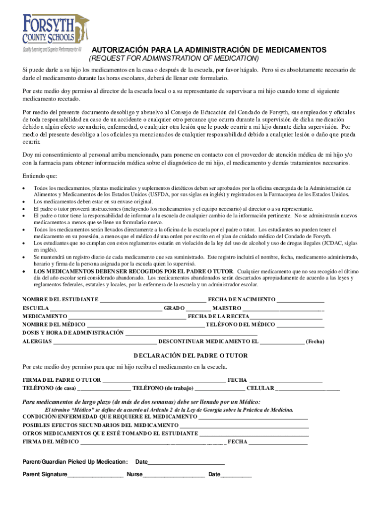 AUTHORIZATION PARA LA ADMINISTRATION DE MEDICAMENT OS (REQUEST FOR ADMINISTRATION OF MEDICATION) Si suede Dale a SU Hilo Los medicament en la Casey o Jesus de la Estela, POR favor halo. Pro is BS