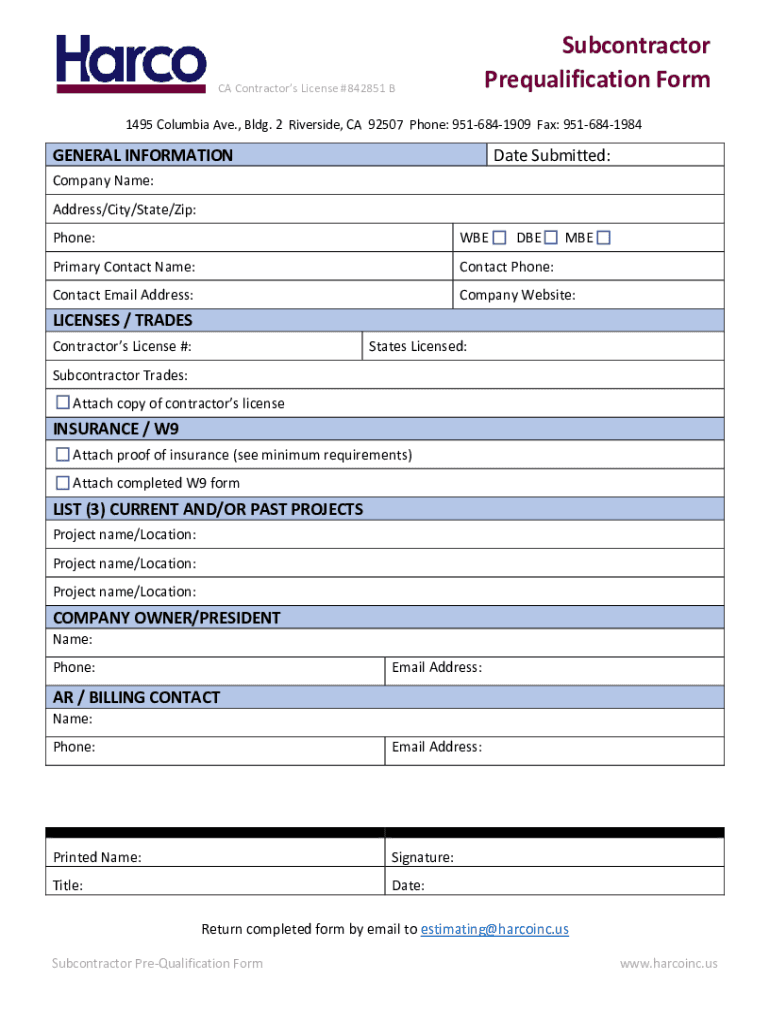 Get the free Subcontractor Prequal Form - harcoinc.us
