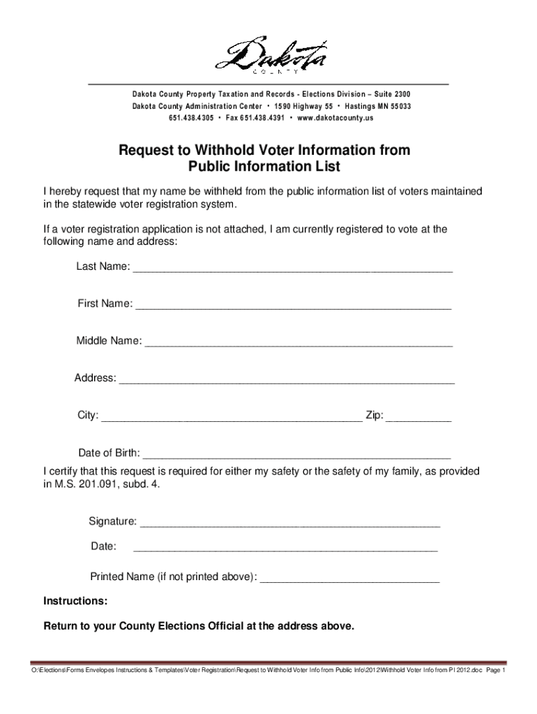 Get the free Online co dakota mn Request to Withhold Voter ...