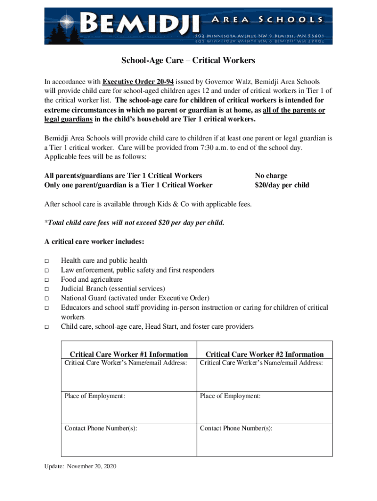 Get the free Child Care for Critical Sectors - Minnesota Department of Health