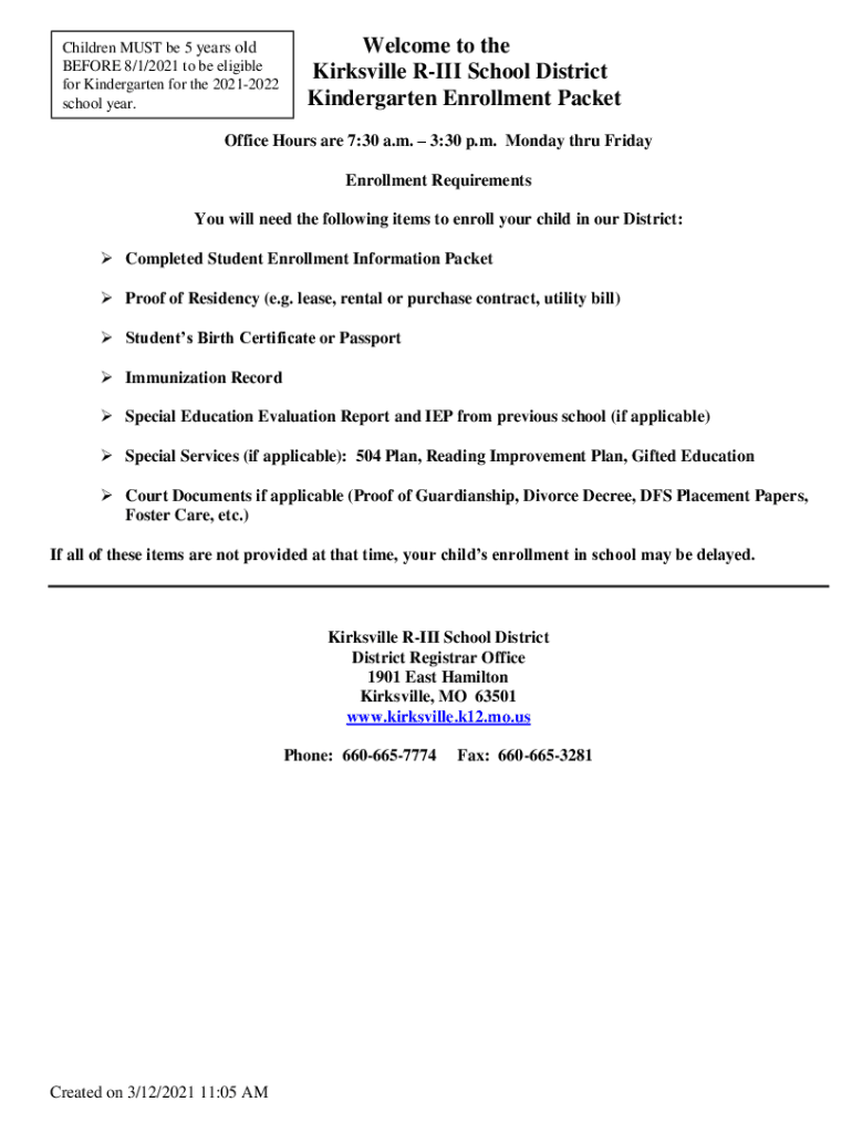 Children MUST be 5 years old BEFORE 8/1/2021 to be eligible for Kindergarten for the 20212022 school year. Welcome to the Clarksville III School District Kindergarten Enrollment Back-office Hours