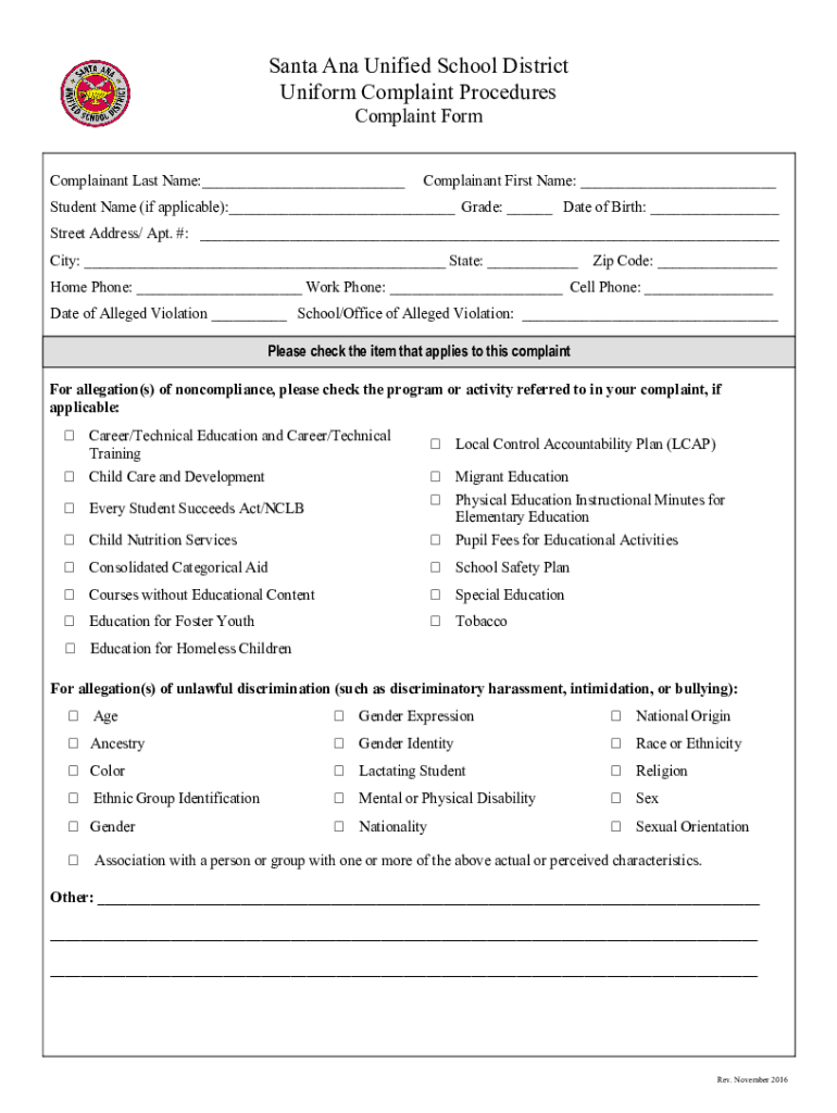 Santa Ana Unified School District Uniform Complaint Procedures Complaint FormComplainant Last Name: Complainant First Name: Student Name (if applicable): Grade: Date of Birth: Street Address/ Apt.