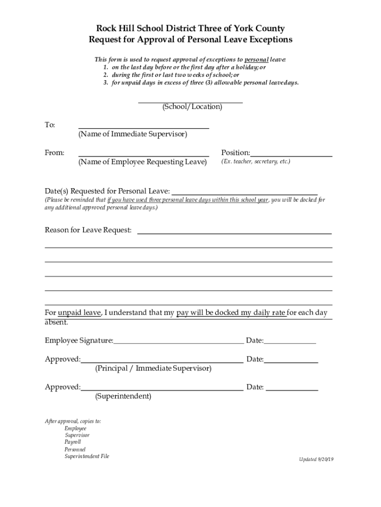 Rock Hill School District Three of York County Request for Approval of Personal Leave Exceptions This form is used to request approval of exceptions to personal leave: 1. On the last day before or