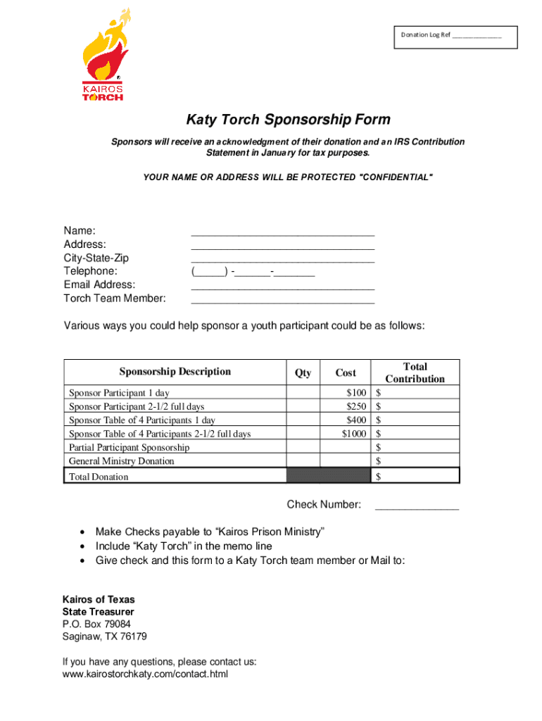 Donation Log Ref Katy Torch Sponsorship Form Sponsors will receive an acknowledgment of their donation and an IRS Contribution Statement in January for tax purposes. YOUR NAME OR ADDRESS WILL BE PROTECTED