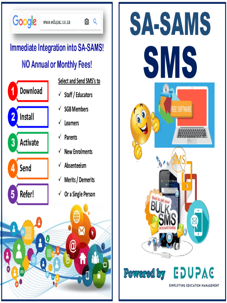 Immediate Integration into SAS AMS!NO Annual or Monthly Fees!1 Download 2 Install Select and Send SMSes to Staff / Educators SGB Members Learners3 Activate Parents4 Send Absenteeism New Enrollments