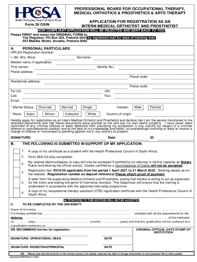 PROFESSIONAL BOARD FOR OCCUPATIONAL THERAPY, MEDICAL ORTHOTICS & PROSTHETICS & ARTS THERAPY APPLICATION FOR REGISTRATION AS AN INTERN MEDICAL ORTHOTIC AND PROSTHETISTForm 26 OPINION COMPLIANT APPLICATION