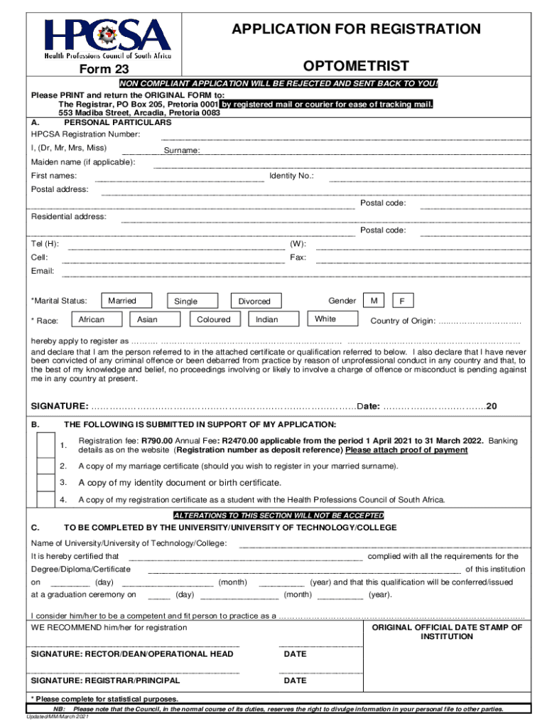 APPLICATION FOR REGISTRATION OPTOMETRISTForm 23NON COMPLIANT APPLICATION WILL BE REJECTED AND SENT BACK TO YOU! Please PRINT and return the ORIGINAL FORM to: The Registrar, PO Box 205, Pretoria 0001
