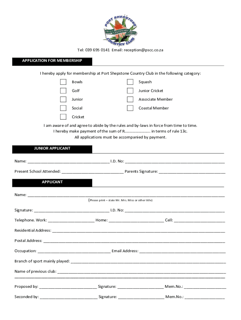Get the free APPLICATION FOR MEMBERSHIP - Port Shepstone Country Club