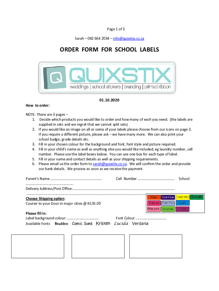 Page 1 of 3 Sarah 082 664 2034 info@quixstix.co.zaORDER FORM FOR SCHOOL LABELS01.10.2020 How to order: NOTE: There are 3 pages 1. Decide which products you would like to order and how many of each