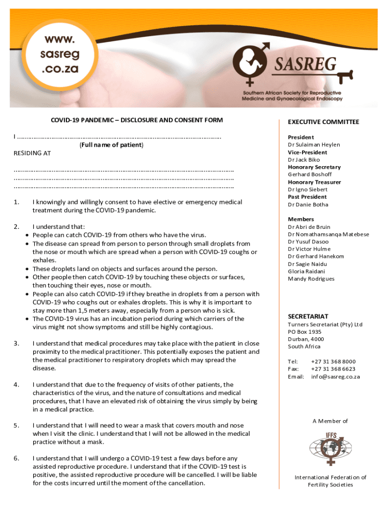 COVID-19 PANDEMIC DISCLOSURE AND CONSENT FORM I ................................................................................................................. (Full name of patient) RESIDING AT
