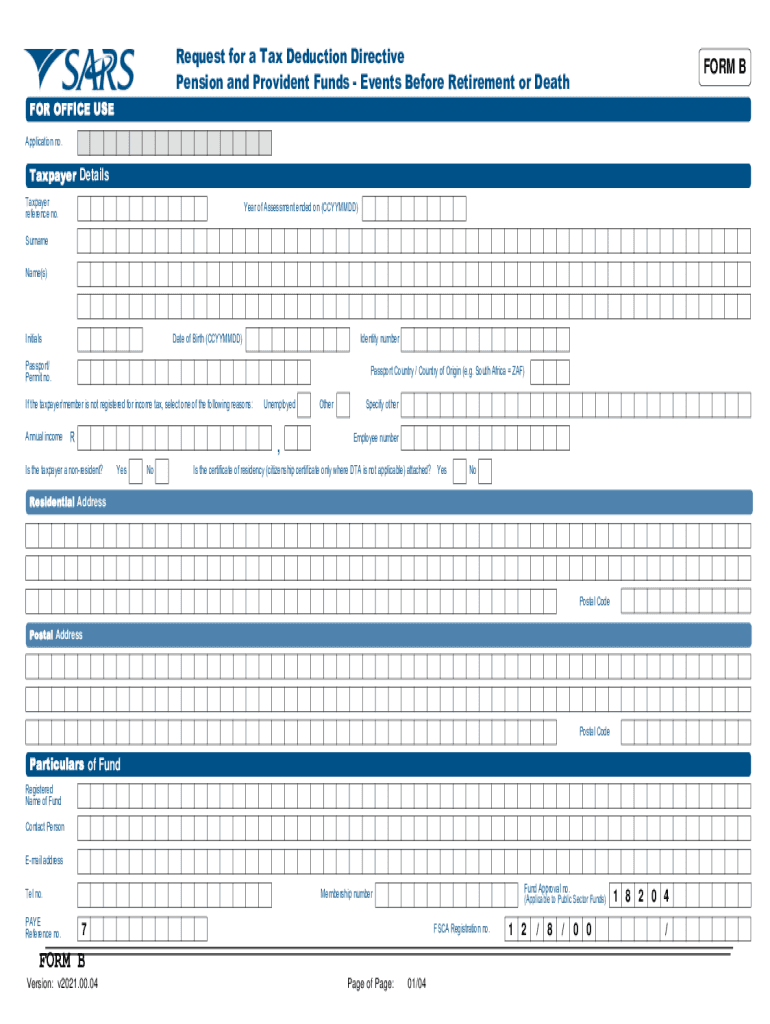 The South African Tax Deduction Directive Form B is a tax document used by taxpayers to request a tax deduction directive for pension and provident funds before retirement or death.