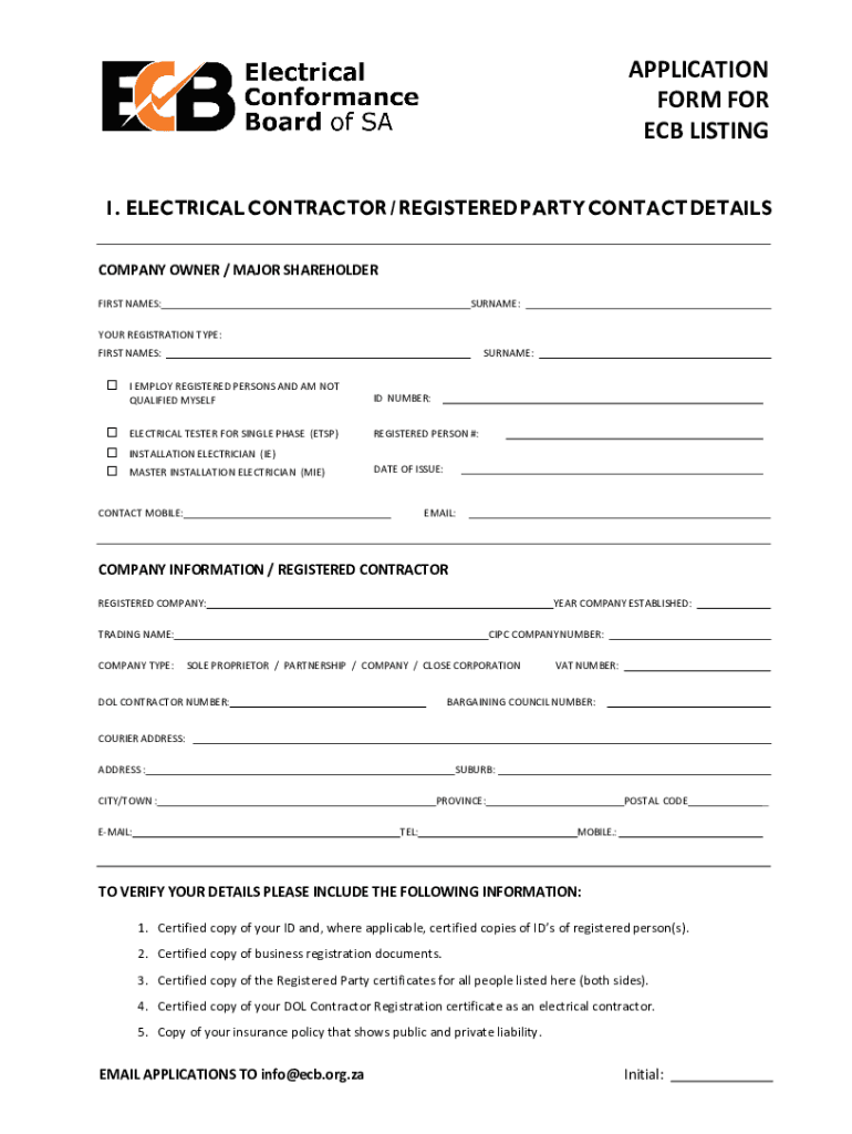APPLICATION FORM FOR ECB LISTING 1. ELECTRICAL CONTRACTOR / REGISTERED PARTY CONTACT DETAILS COMPANY OWNER / MAJOR SHAREHOLDER FIRST NAMES:SURNAME:YOUR REGISTRATION TYPE: FIRST NAMES:SURNAME: I EMPLOY