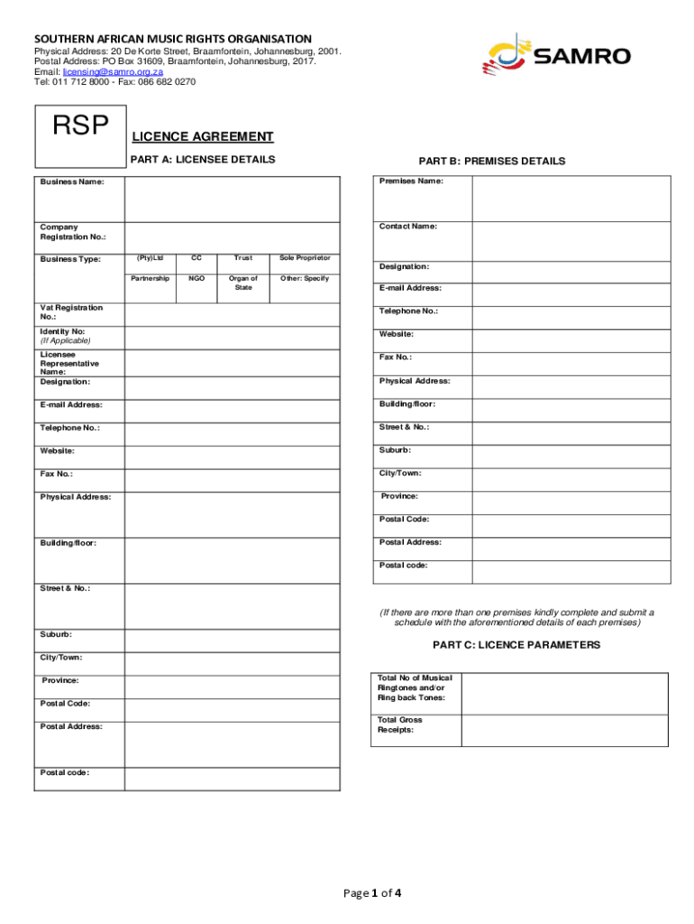 SOUTHERN AFRICAN MUSIC RIGHTS Organization Physical Address: 20 De Forte Street, Bloemfontein, Johannesburg, 2001. Postal Address: PO Box 31609, Bloemfontein, Johannesburg, 2017. Email: licensing@samro.org.za