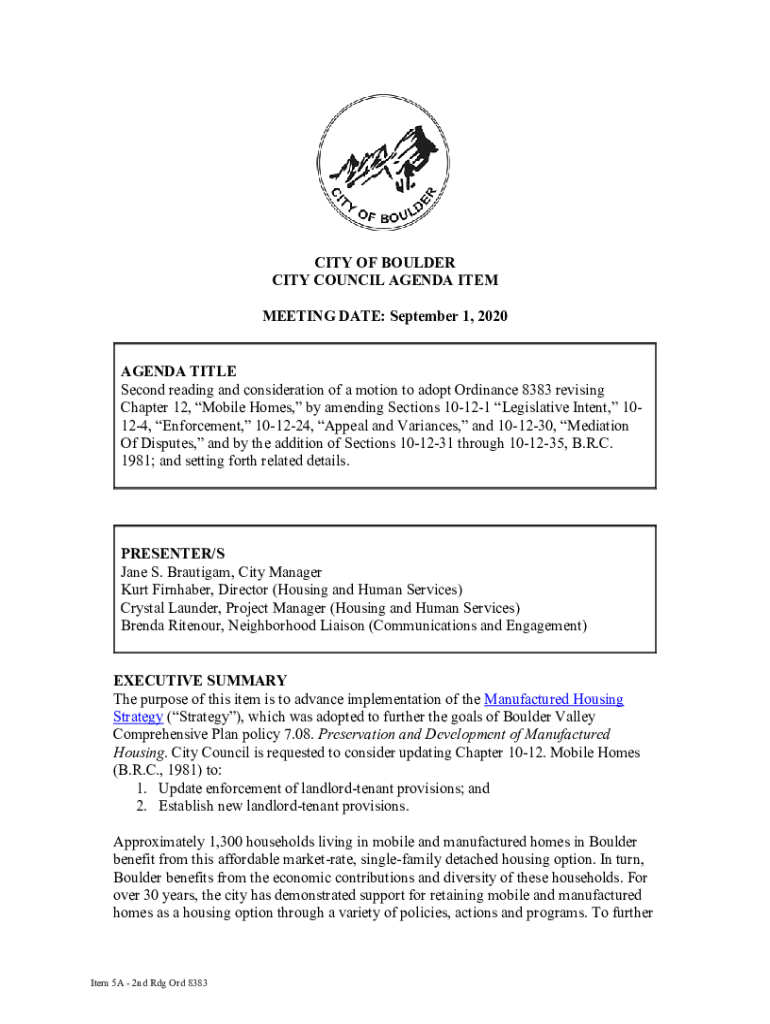 CITY OF BOULDER CITY COUNCIL AGENDA ITEM MEETING DATE: September 1, 2020, AGENDA TITLE Second reading and consideration of a motion to adopt Ordinance 8383 revising Chapter 12, Mobile Homes, by amending