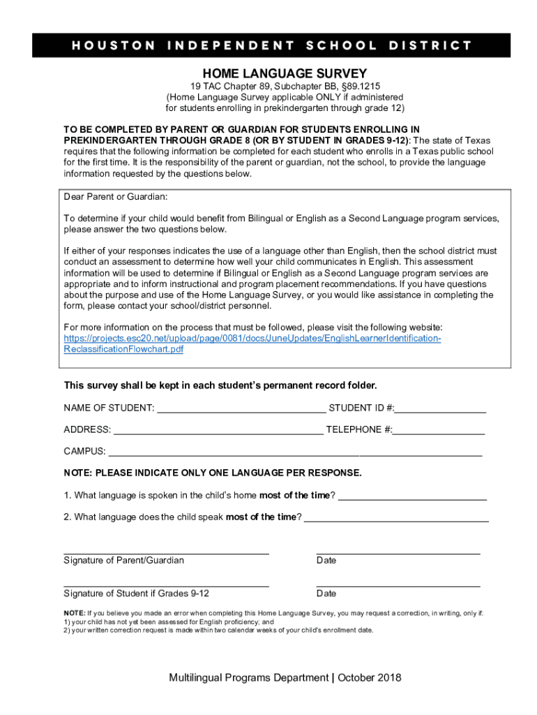HOME LANGUAGE SURVEY 19 TAC Chapter 89, Subchapter BB, 89.1215 (Home Language Survey applicable ONLY if administered for students enrolling in prekindergarten through grade 12) TO BE COMPLETED BY