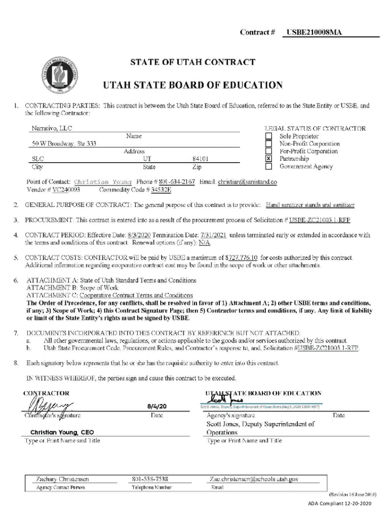 Contract#;: “Yahoo, .instate OF UTAH CONTRACT, 1.USBE210008MAUTAH STATE BOARD OF EDUCATIONCONTRACTING PARTIES: This contract is between the Utah State Board of Education, referred to as the State