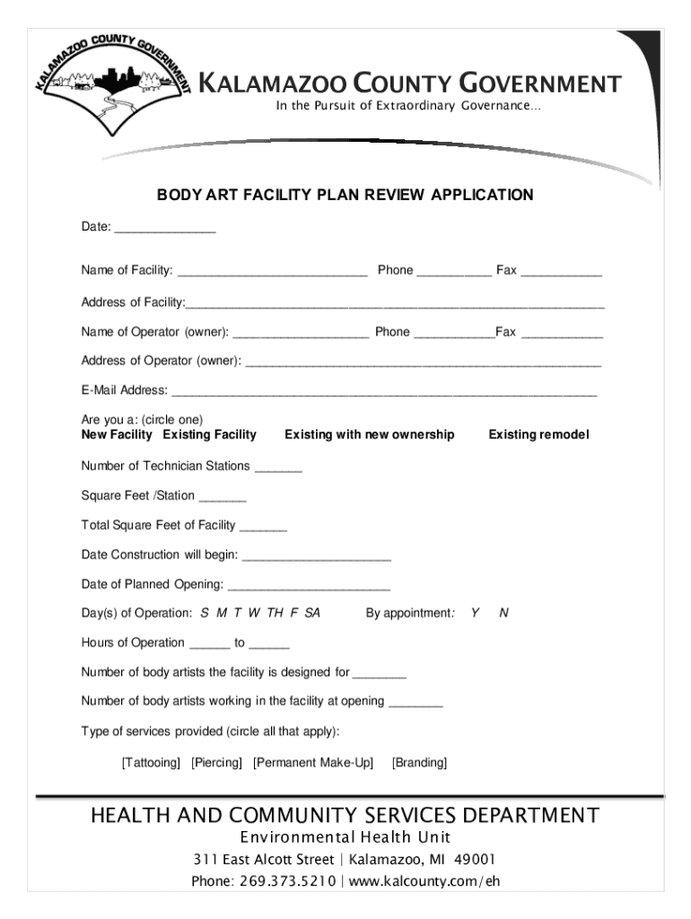 KALAMAZOO COUNTY GOVERNMENT In the Pursuit of Extraordinary GovernanceBODY ART FACILITY PLAN REVIEW APPLICATION Date: Name of Facility: Phone Fax Address of Facility: Name of Operator (owner): Phone