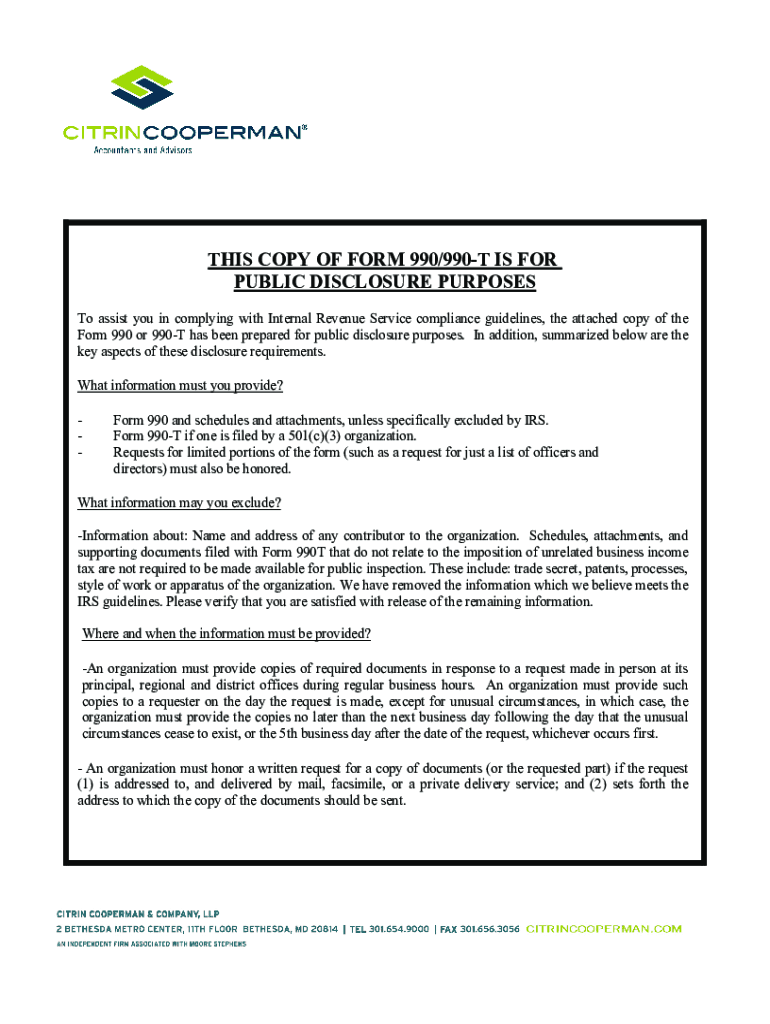 THIS COPY OF FORM 990/990T IS FOR PUBLIC DISCLOSURE PURPOSES To assist you in complying with Internal Revenue Service compliance guidelines, the attached copy of the Form 990 or 990T has been prepared