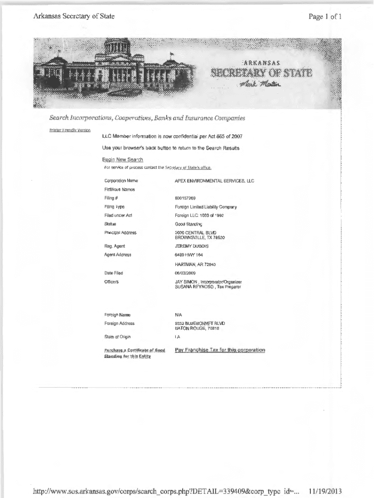 Arkansas Secretary of State Page 1 of 1ARKANSASSECRETARY OF STATE ?f1aJ. Search Incorporation, Cooperatives, Banks and Insurance Companies Printer Friendly Version LLC Member information is now confidential