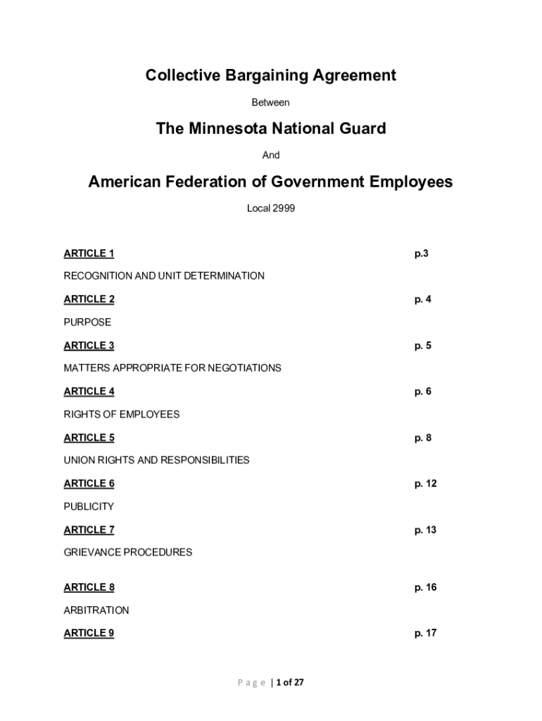 Collective Bargaining Agreement Between Minnesota National Guard And American Federation of Government Employees Local 2999ARTICLE 1p.3RECOGNITION AND UNIT DETERMINATION ARTICLE 2p. 4PURPOSE ARTICLE