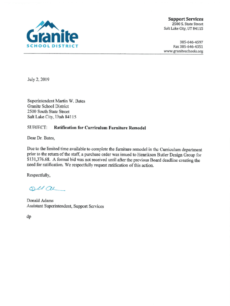 THE FOLLOWING PROPOSAL, SUBMITTED BY JARED B. GARDNER, DIRECTOR OF PURCHASING, IS RECOMMENDED FOR BOARD APPROVAL. Superintendent of Schools July 9, 2019, Superintendent Martin Bates Granite School