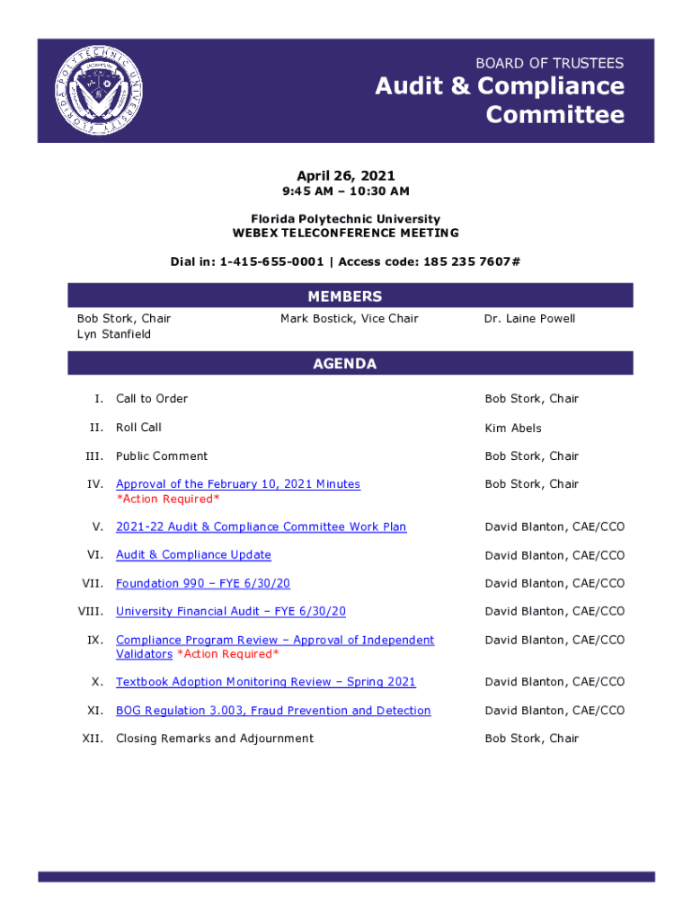BOARD OF TRUSTEESAudit & Compliance Committee April 26, 20219:45 AM 10:30 AM Florida Polytechnic University WEBEX TELECONFERENCE MEETING Dial in: 14156550001 Access code: 185 235 7607#MEMBERS Bob