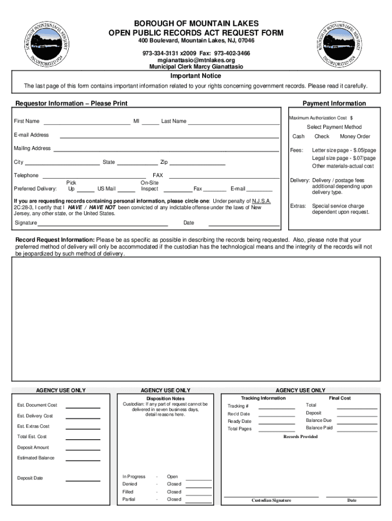 BOROUGH OF MOUNTAIN LAKES OPEN PUBLIC RECORDS ACT REQUEST FORM 400 Boulevard, Mountain Lakes, NJ, 07046 9733343131 x2009 Fax: 9734023466 mgianattasio@mtnlakes.org Municipal Clerk Marcy GianattasioImportant