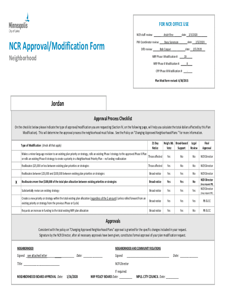 FOR NCR OFFICE USE NCR staff review: NCR Approval/Modification Formation Fine date: 2/3/2020 PM Coordinator review: Stacy Sorenson date: 2/5/2020 DID review: Bob Cooper date: 2/5/2020 Neighborhood