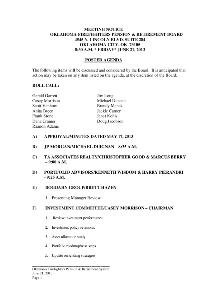 MEETING NOTICE OKLAHOMA FIREFIGHTERS PENSION & RETIREMENT BOARD 4545 N. LINCOLN BLVD. SUITE 284 OKLAHOMA CITY, OK 73105 8:30 A.M. * FRIDAY* JUNE 21, 2013, POSTED AGENDA The following items will be