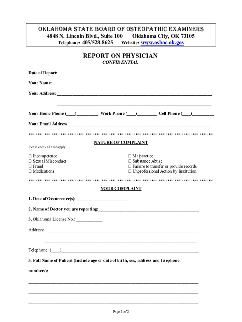 OKLAHOMA STATE BOARD OF OSTEOPATHIC EXAMINERS 4848 N. Lincoln Blvd., Suite 100 Oklahoma City, OK 73105 Telephone: 405/5288625 Website: www.osboe.ok.govREPORT ON PHYSICIAN CONFIDENTIAL Date of Report: