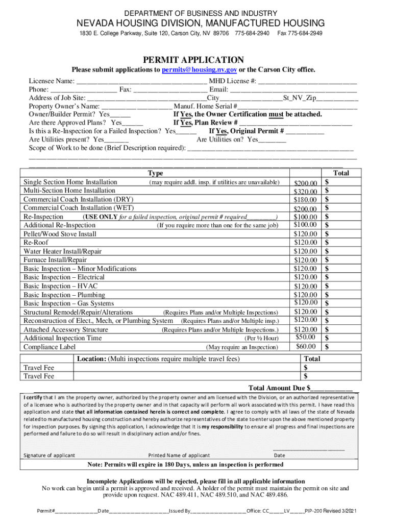 DEPARTMENT OF BUSINESS AND INDUSTRYNEVADA HOUSING DIVISION, MANUFACTURED HOUSING 1830 E. College Parkway, Suite 120, Carson City, NV 897067756842940Fax 7756842949PERMIT APPLICATIONPlease submit applications