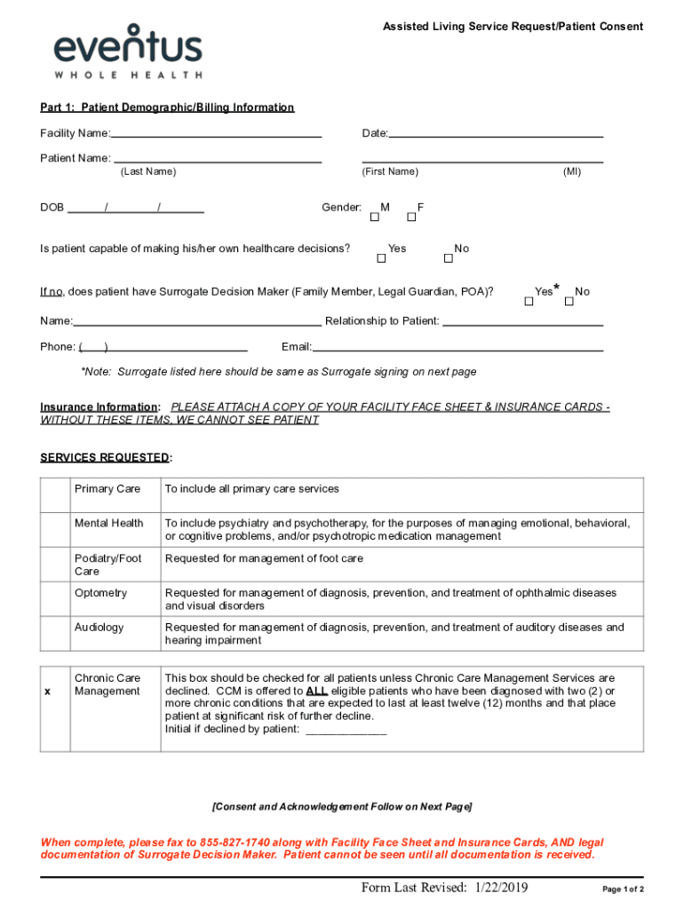 Assisted Living Service Request/Patient ConsentPart 1: Patient Demographic/Billing Information Facility Name:Date:Patient Name: (Last Name)DOB/(First Name)/Gender:Is patient capable of making his/her