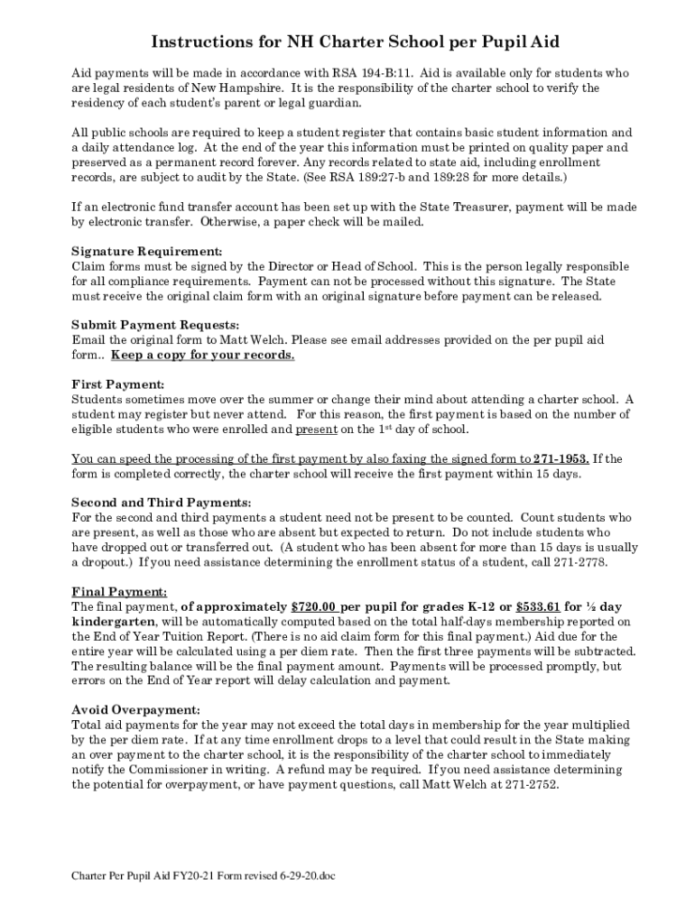 Instructions for NH Charter School per Pupil Aid payments will be made in accordance with RSA 194B:11. Aid is available only for students who are legal residents of New Hampshire. It is the responsibility