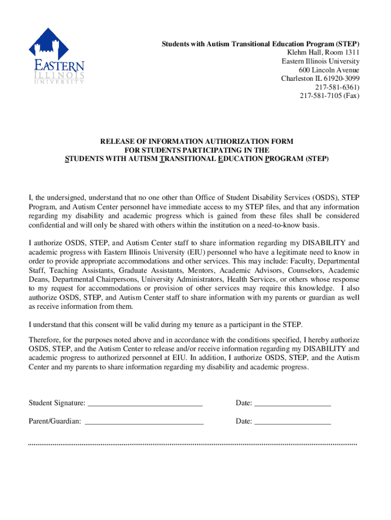 Students with Autism Transitional Education Program (STEP) Klein Hall, Room 1311 Eastern Illinois University 600 Lincoln Avenue Charleston IL 619203099 2175816361) 2175817105 (Fax)RELEASE OF INFORMATION