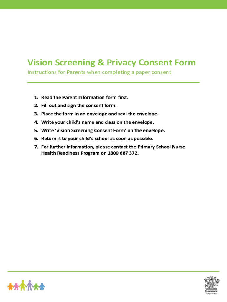 Vision Screening & Privacy Consent Form Instructions for Parents when completing a paper consent1. Read the Parent Information form first. 2. Fill out and sign the consent form. 3. Place the form