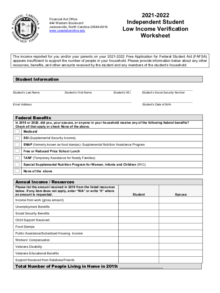20212022 Independent Student Low Income Verification WorksheetFinancial Aid Office 444 Western Boulevard Jacksonville, North Carolina 285466816 www.coastalcarolina.eduThe income reported for you and/or
