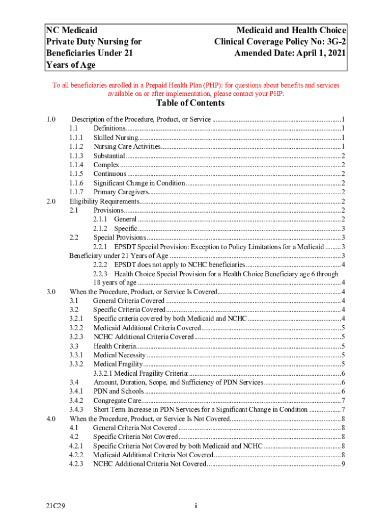 NC Medicaid Private Duty Nursing for Beneficiaries Under 21 Years of Age Medicaid and Health Choice Clinical Coverage Policy No: 3G2 Amended Date: April 1, 2021To all beneficiaries enrolled in a Prepaid