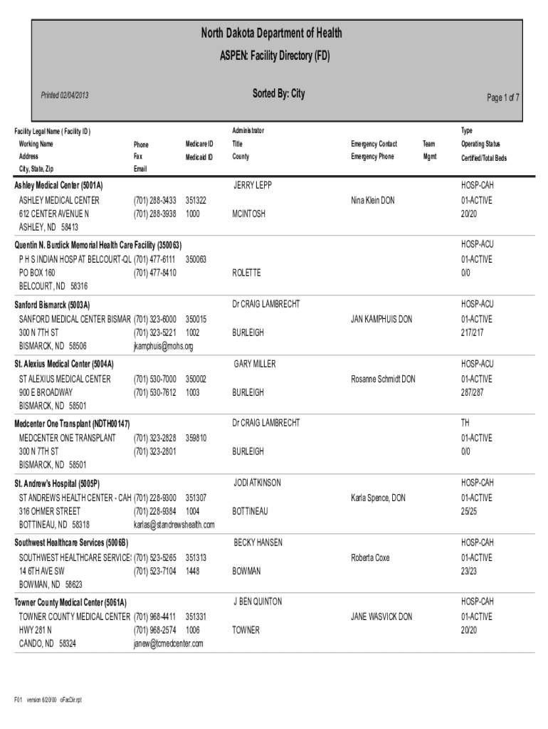 North Dakota Department of Health ASPEN: Facility Directory (FD) Sorted By: Imprinted 02/04/2013Facility Legal Name (Facility ID) Working Name Address City, State, Zip Ashley Medical Center (5001A)