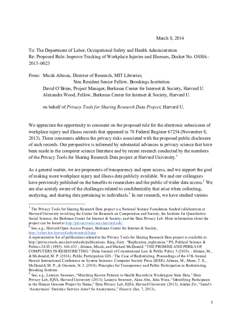 March 8, 2014, To: The Department of Labor, Occupational Safety and Health Administration Re: Proposed Rule: Improve Tracking of Workplace Injuries and Illnesses, Docket No. OSHA 20130023 From: Micah