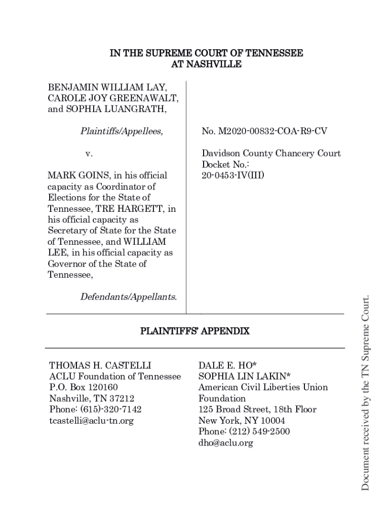 IN THE SUPREME COURT OF TENNESSEE AT NASHVILLE BENJAMIN WILLIAM LAY, CAROLE JOY GREENWALD, and SOPHIA LUANGRATH, v. MARK GOING, in his official capacity as Coordinator of Elections for the State of