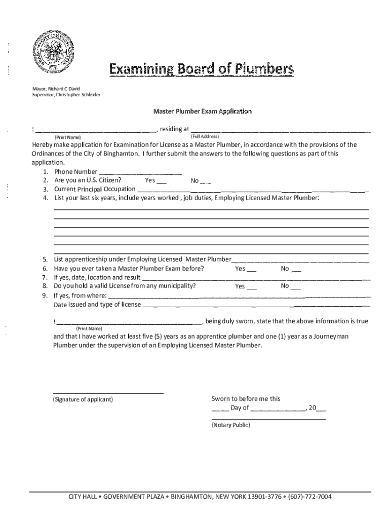 Mayor, Richard C David Supervisor, Christopher SchleiderMaster Plumber ! Exam residing at (Print Name(Full AddressHereby make application for Examination for License as a Master Plumber, in accordance
