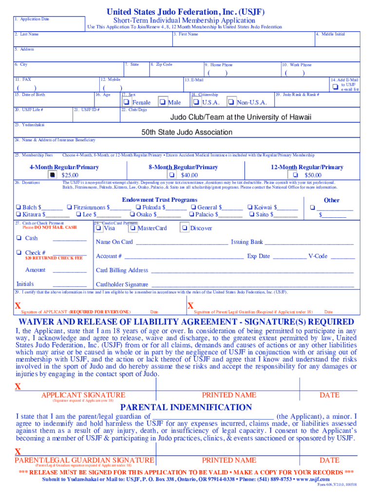 United States Judo Federation, Inc. (USAF)PrintShortTerm Individual Membership Application1. Application DateResetUse This Application To Join/Renew 4, 8, 12 Month Membership In United States Judo