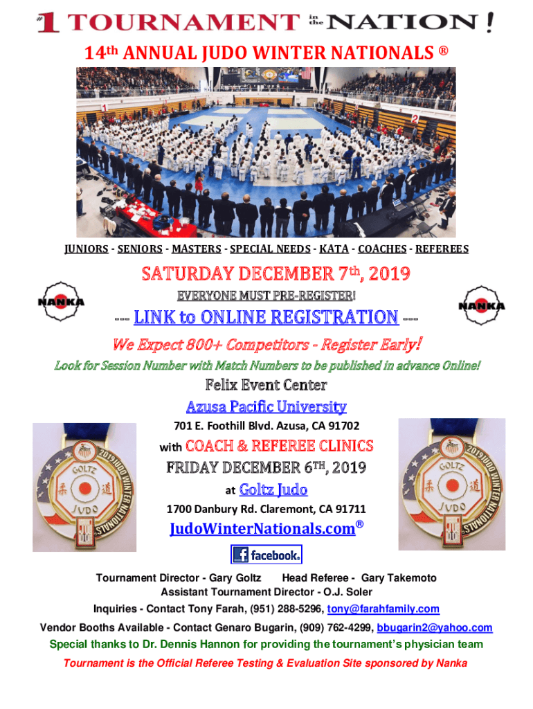 14th ANNUAL JUDO WINTER NATIONALS JUNIORS SENIORS MASTERS SPECIAL NEEDS DATA COACHES REFEREESSATURDAY DECEMBER 7th, 2019 EVERYONE MUST PREREGISTER! LINK to ONLINE REGISTRATION We Expect 800+ Competitors