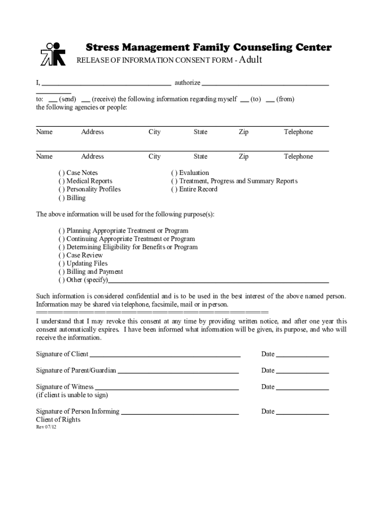 300 E. Stress Management Family Counseling Center RELEASE OF INFORMATION CONSENT FORM Adult, authorize to: (send) (receive) the following information regarding myself the following agencies or people:(to)(from)NameAddressCityStateZipTelephoneNameAddressCityStateZipTelephone()