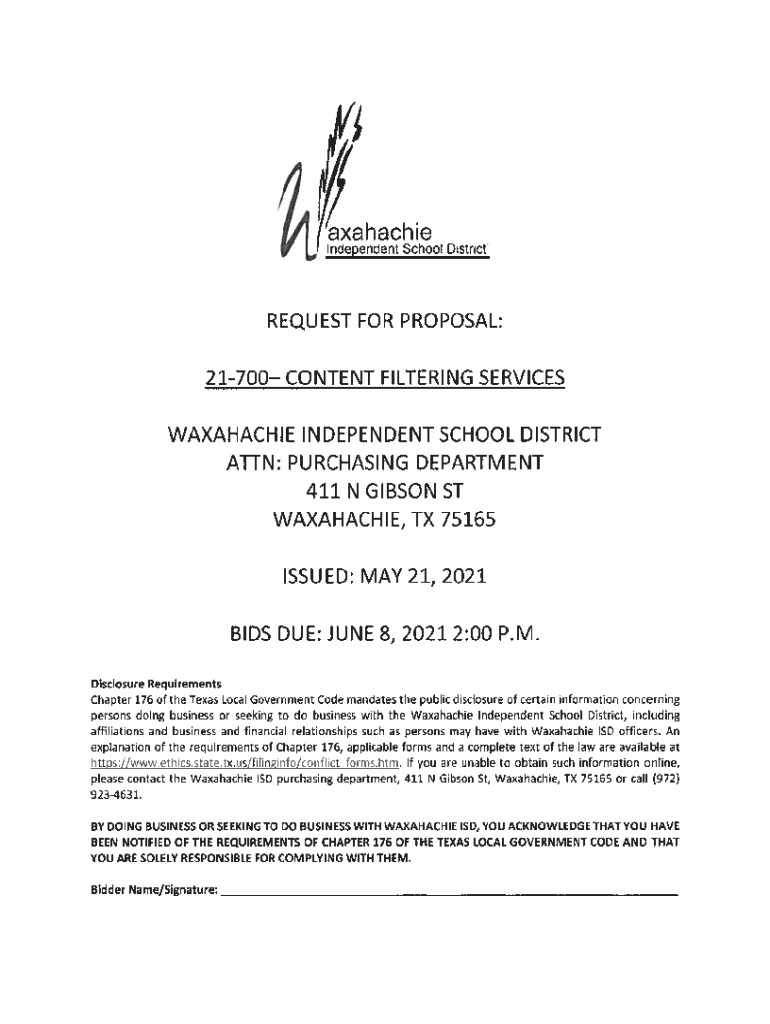 XahachieIndependent School DistricUREQUEST FOR PROPOSAL: 21700 CONTENT FILTERING SERVICES WAXAHACHIE INDEPENDENT SCHOOL DISTRICT ATTN: PURCHASING DEPARTMENT 411 N GIBSON ST WAXAHACHIE, TX 75165 ISSUED: