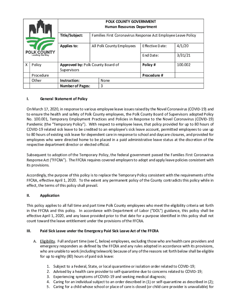POLK COUNTY GOVERNMENT Human Resources DepartmentXFamilies First Coronavirus Response Act Employee Leave PolicyApplies to:All Polk County EmployeesApproved by: Polk County Board of SupervisorsPolicy