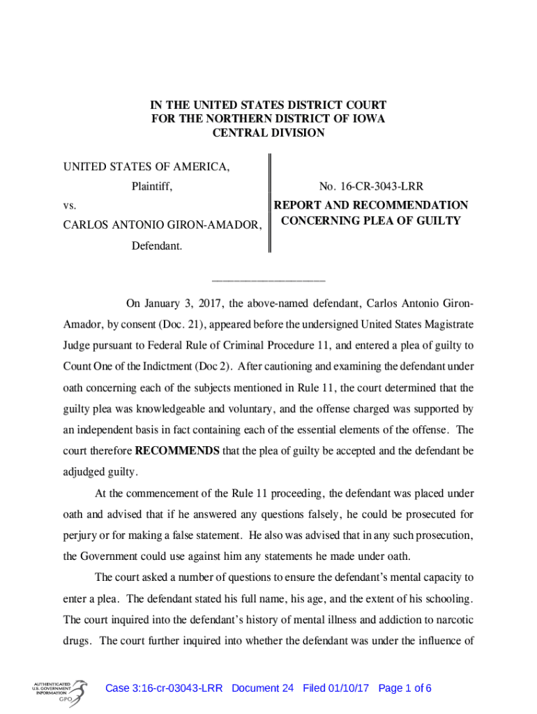 IN THE UNITED STATES DISTRICT COURT FOR THE NORTHERN DISTRICT OF IOWA CENTRAL DIVISION UNITED STATES OF AMERICA, Plaintiff, No. 16CR3043LRRvs. CARLOS ANTONIO GIRONAMADOR, REPORT AND RECOMMENDATION
