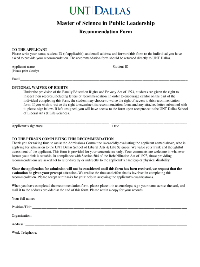 Master of Science in Public Leadership Recommendation Form TO THE APPLICANT Please write your name, student ID (if applicable), and email address and forward this form to the individual you have asked