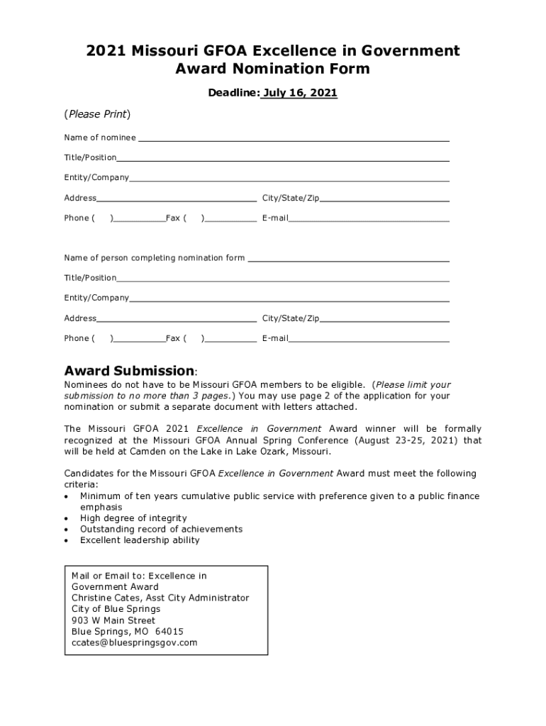 2021 Missouri GOA Excellence in Government Award Nomination Form Deadline: July 16, 2021 (Please Print) Name of nominee Title/Position Entity/Company Address Phone (City/State/Zip)Fax ()Emanate of